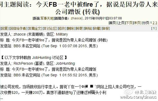 帖子中說道,Facebook一名華裔員工因為帶人來公司蹭飯而被開除了。帖子中還提到,被開除員工是通過一個旅游中介網站(以下簡稱旅網)找到想來Facebook體驗高大上食堂的游客,然后以每位20美元的價格帶他們進公司吃飯,并可以深度旅游拍照。結果他一天帶了10個人去食堂,被發現后就被開除了。