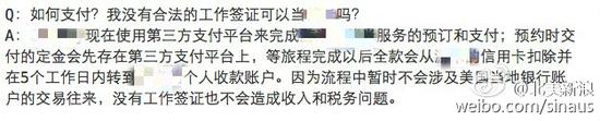 網友“aros516”說:看旅網FAQ里問沒有工作簽證能不能干陪游,人白紙黑字寫不光沒有工作簽證沒關系,也不用交稅。這給人告到移民局和IRS,那是一告一個準,分分鐘被掃蕩啊。雖然美國打黑工做代購的不少,但這么明目張膽白紙黑字寫在網站我們可以打黑工逃稅的,真是第一次見。