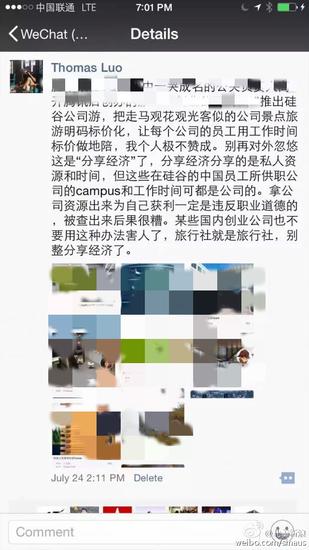 Ping West 網站負責人 Thomas Luo 所發的朋友圈,表示不贊同這種分享經濟: