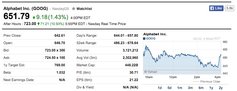 Alphabet股價周四在納斯達克交易所的開盤價為646.70美元。截至周四收盤,Alphabet股價上漲9.18美元,收報651.79美元,漲幅為1.43%。截至美國東部時間周四17:55分(北京時間周五5:55分),Alphabet股價在盤后交易中上漲71.21美元至723.00美元,漲幅為10.93%。過去52周,Alphabet股價最高為678.64美元,最低為486.23美元。(編譯/簫雨)