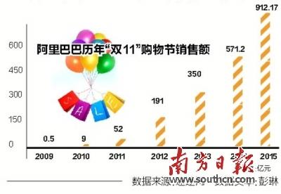 2009年,阿里借由網絡戲謔詞“光棍節”生造出了個“雙11購物節”。那一年,阿里“雙11”的成交額僅為0.5億元,網絡購物占全社會消費品零售總額比重不到2%。7年后,阿里“雙11”成交額突破900億元。截至2014年12月中國網絡零售市場交易規模占到社會消費品零售總額的10.6%。
