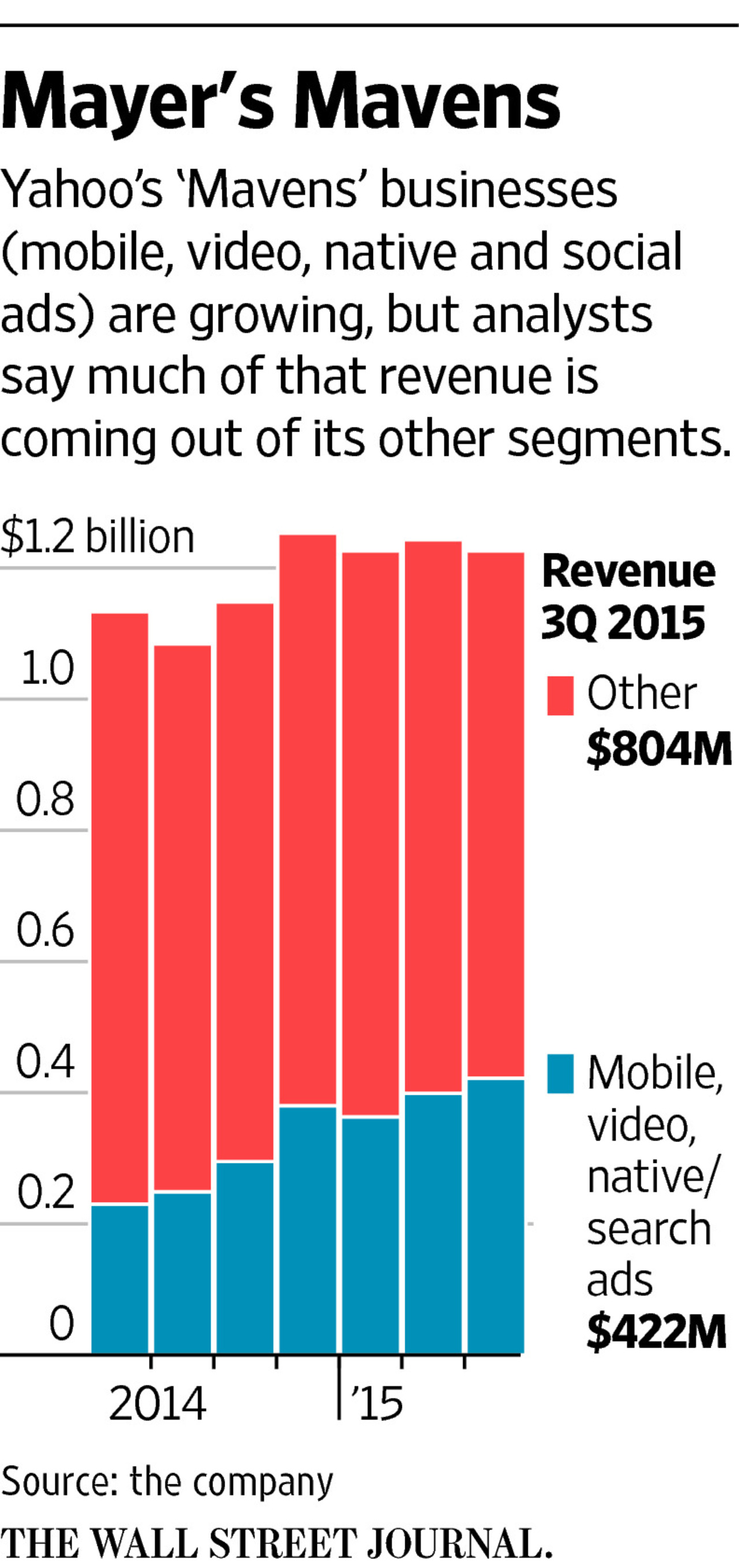 據(jù)與梅耶爾有密切工作關(guān)系的人稱,在必須披露壞消息時,她會顧左右而言他,放出其他吸引人的消息,分散人們的注意力。例如,建立Mavens業(yè)務(wù)部門,其中包括移動、視頻、原生和社交廣告業(yè)務(wù),但不包括PC展示廣告業(yè)務(wù)。分析師稱,Mavens營收的增長是以犧牲雅虎桌面業(yè)務(wù)為代價的。