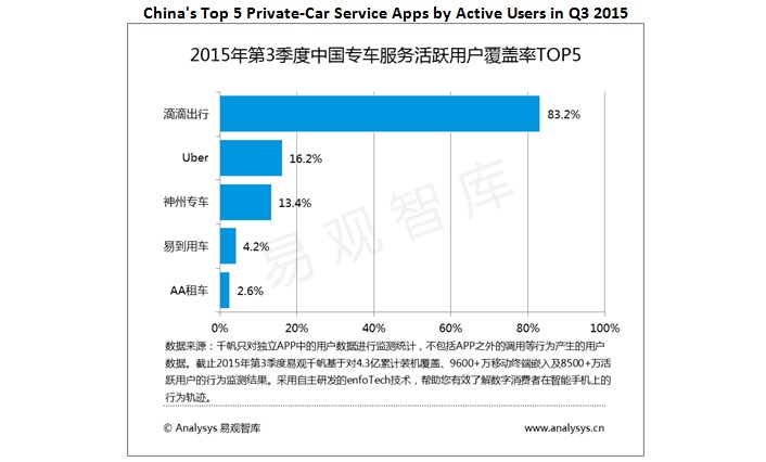 易觀國際(Analysys International)上月發布報告稱,在專車領域,滴滴快的依然是中國市場的領導者,而且其領先優勢還在不斷擴大。報告顯示滴滴快的在專車服務活躍用戶覆蓋率上達到了83.2%,而在這一數字上,Uber只有可憐的16.2%。(編譯/呂佳輝)