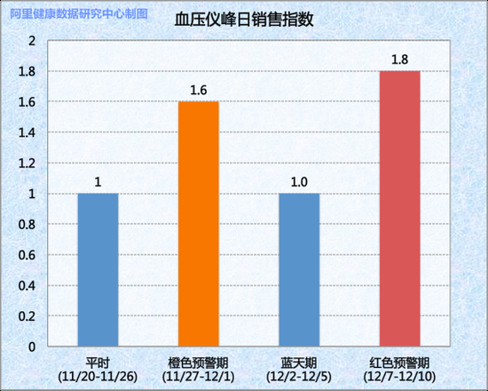 這個醫學研究結論,在阿里健康數據研究中心發布的霧霾消費趨勢圖中被確切驗證出來:血壓計的購買行為和霧霾發生的時間段高度匹配:在北京11月27日-12月1日的霧霾期間,阿里零售平臺上的血壓儀器銷量突然飆升,并于11月30日達到峰值;12月7日至9日霧霾期間血壓儀銷量也同步飆高,在12月8日達到峰值,成為雙12前的兩個銷售小高峰。