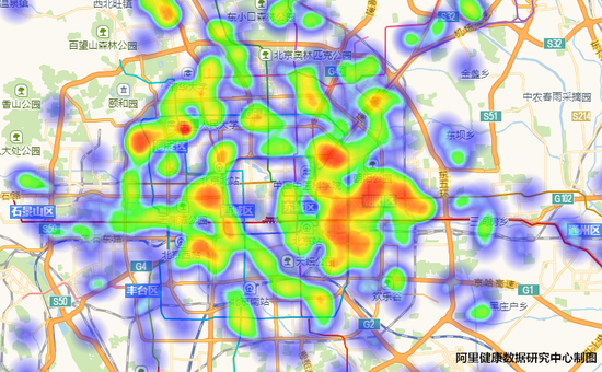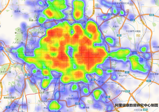 阿里健康數據研究中心提供的阿里零售平臺“空氣凈化器”銷售熱力圖顯示,2015年6月16日至12月15日期間,100元價位以上的低價位空氣凈化器配送地點遍布北京四環內區域及通州區,其中,東城、西城、朝陽和海淀等人口密集地區銷量最大。熱力圖中故宮、北海、奧森公園由于無人居住留出了明顯的空白區域。