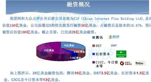 美團點評28億美元融資中,包括國內一家互聯網巨頭的10億美元投資,另外,DST投了3.5億美元,紅杉資本投資1.5億美元、CICC及今日資本等一共投資了13億美元。據知情人士透露,美團點評還在繼續融資,最終融資金額會超過30億美元。