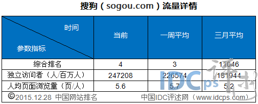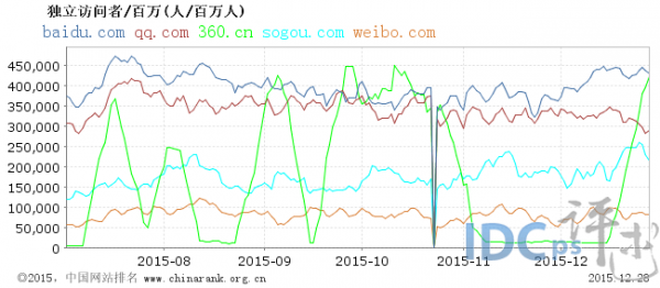 IDC評(píng)述網(wǎng)(idcps.com)12月31日?qǐng)?bào)道:根據(jù)中國(guó)互聯(lián)網(wǎng)協(xié)會(huì)-中國(guó)網(wǎng)站排名公布的最新數(shù)據(jù)顯示,截至2015年12月28日,國(guó)內(nèi)網(wǎng)站獨(dú)立訪問(wèn)量五強(qiáng)排名依次是百度、360安全中心、騰訊網(wǎng)、搜狗、微博。具體情況如下圖所示: