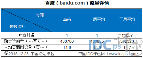 百度是全球最大的中文搜索引擎,2000年1月由李彥宏、徐勇兩人創(chuàng)立于北京中關(guān)村。截止2015年12月28日,在百度綜合排名中,當(dāng)前與一周平均一致,均為第1。其當(dāng)前獨(dú)立訪問(wèn)者為430700個(gè),與一周平均相差無(wú)幾。而當(dāng)前人均頁(yè)面瀏覽量14.6頁(yè),小于一周平均、三月平均。