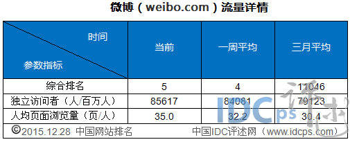 新浪微博是極具影響力的微博,通過(guò)140字記錄,“織圍脖”是網(wǎng)友隨時(shí)隨地記錄生活、分享社會(huì)新鮮事的生活方式。截止2015年12月28日,微博綜合排名當(dāng)前第5,相比一周平均下降1位。而在獨(dú)立訪問(wèn)者與人均頁(yè)面瀏覽量中,當(dāng)前數(shù)值均最大,分別是85617人、35.0頁(yè)。