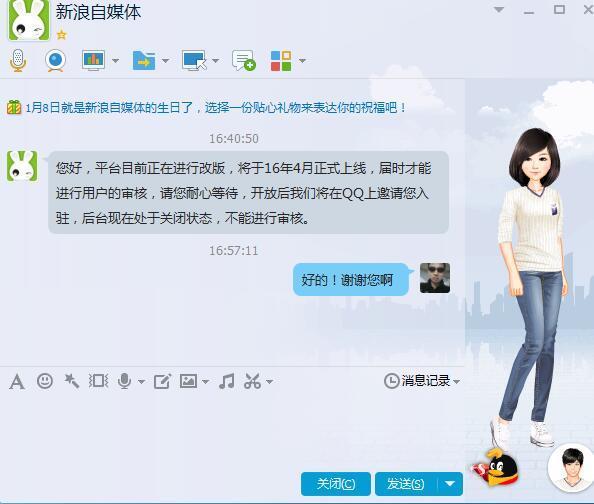 新浪自媒體官方QQ回復說,平臺目前正在進行改版,將于16年4月正式上線,屆時才能進行用戶的審核,請您耐心等待,開放后我們將在QQ上邀請您入駐,后臺現(xiàn)在處于關(guān)閉狀態(tài),不能進行審核。“