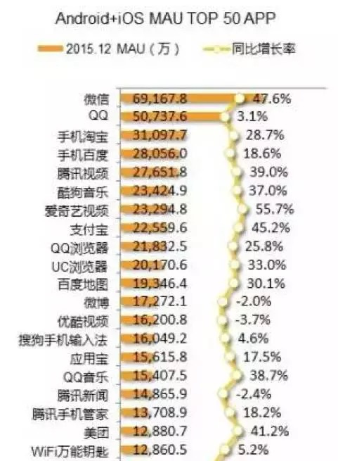 MAU(月獨立用戶數)排名前20的產品里面,只有微博、美團和Wifi萬能鑰匙是非BAT的。