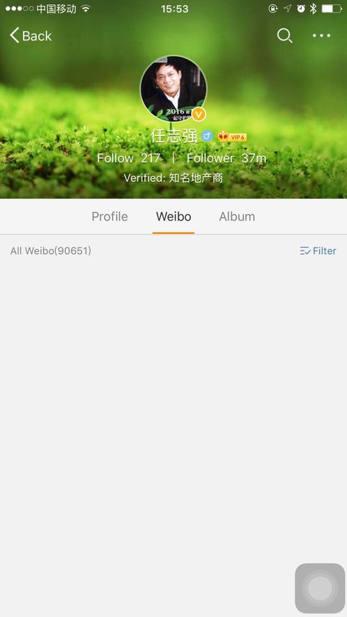繼演員孫海英、大鵬看天下等500多個(gè)大V微博被關(guān)閉之后,今天(2月28日),網(wǎng)信辦正式責(zé)令新浪、騰訊等網(wǎng)站關(guān)閉任志強(qiáng)微博。而從任志強(qiáng)微博表現(xiàn)來看,他微博應(yīng)該是在上周四(2月25日)就被禁言。目前在手機(jī)新浪微博APP上搜索任志強(qiáng),得到結(jié)果如下: