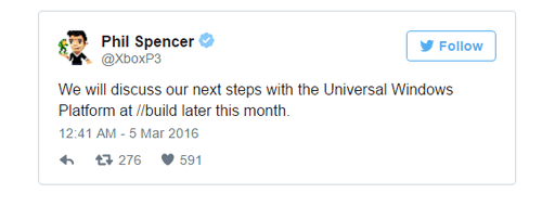 微軟Xbox業(yè)務主管菲爾?斯賓塞(PhilSpencer)在其個人Twitter上發(fā)表了一條推特“微軟將在本月底的Build大會上與開發(fā)者探討Windows通用平臺的進一步發(fā)展。”菲爾?斯賓塞還對外界對此前EpicGames聯(lián)合創(chuàng)始人蒂姆?斯維尼(TimSweeney)的言論進行了回擊:“Windows一直是一個開放的生態(tài)系統(tǒng),歡迎所有硬件和軟件廠商前來合作,我們將一直保持這樣的理念。”蒂姆?斯維尼曾公開表示微軟違反開放品平臺精神,而試圖將微軟全套產品做成一個“awalledgarden”(圍墻花園,指封閉性)。