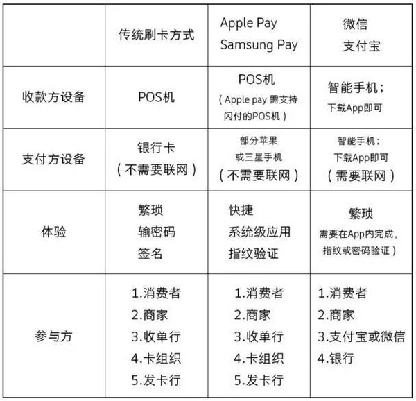 除了設(shè)備,網(wǎng)絡(luò)和體驗(yàn)上的差別,Pay 們和支付寶微信的最本質(zhì)差別就是付款流程和參與方。