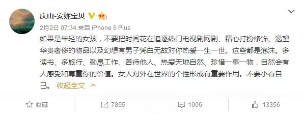 就拿居于榜首的安妮寶貝為例。作為網紅1.0時代的領頭人,早期的安妮寶貝討年輕人喜歡——糜爛的愛情、人生的孤獨感之類的話題很容易引發共鳴,加之文字不錯,紅得有道理。從她現在的微博來看,大多數內容還是些發人深省的文字,旨在用自身的文學造詣吸引粉絲,基本上不以廣告作為收入來源。