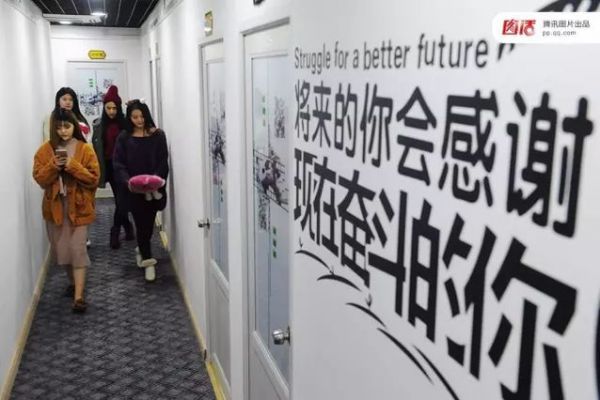 圖為2015年12月7日,安徽阜陽幾名網絡女主播上班時經過狹窄的走廊