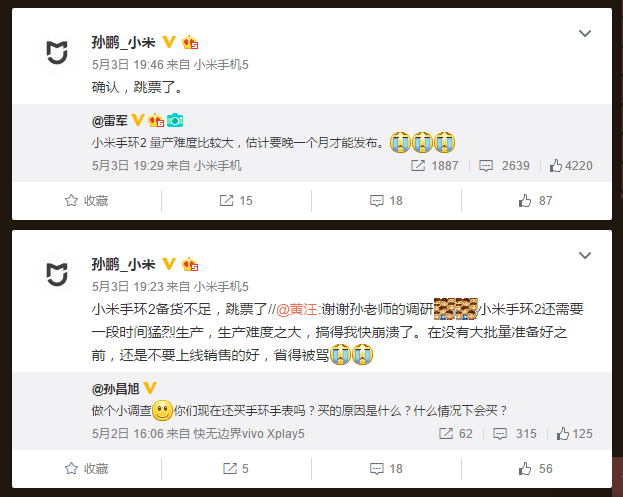 關(guān)于小米手環(huán)2跳票,微博截圖如下。