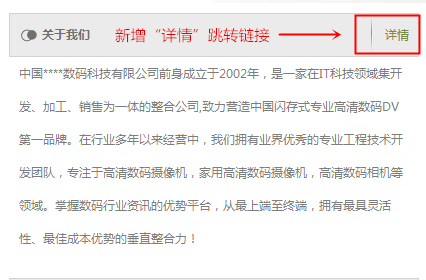 該模塊新增“詳情”跳轉鏈接,便于用戶點擊,瀏覽關于企業(yè)的更多品牌介紹。商家可在后臺點擊“自定義頁面”,進入“關于我們”,自主添加企業(yè)介紹(包括顯示在主頁面的簡短描述,以及二級頁面的詳情介紹)。