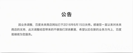 DoNews 6月17日消息(編輯 鄭亭亭)6月17日消息,百度于6月15日正式關停了旗下電商平臺百度未來商店。目前打開度未來商店的頁面,只能看到關停公告。