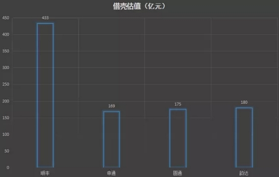 四家快遞公司當中,順豐是第一梯隊,另外3家為第二梯隊。沒有算上中通、宅急送等其他快遞公司,僅僅這4家已宣布借殼上市的快遞公司,總估值就已經高達近1000億元(957億)!