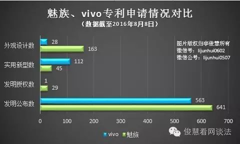 來自國家知識產權局網站的統計數據顯示,截止2016年8月8日,魅族提交的專利申請中,發明公布數為641件,發明授權數29件,實用新型數45件,外觀設計數163件。