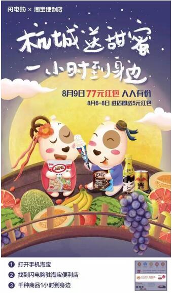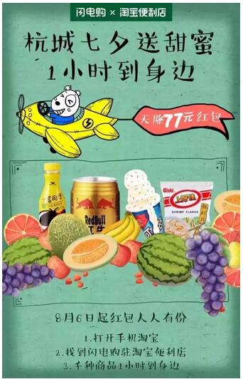 8 月 9 日農(nóng)歷七夕節(jié)到來之際,閃電購和手機(jī)淘寶聯(lián)合在杭州推出七夕情人節(jié)聯(lián)合促銷活動(dòng),為市民提供水果、冷飲和飲料零食等商品的全城「 一小時(shí)」閃電送達(dá)服務(wù)。此前一天,閃電購剛公布獲得阿里 2.67 億元人民幣投資,雙方將進(jìn)行戰(zhàn)略合作,次日,閃電購便與阿里旗下手機(jī)淘寶進(jìn)行了首次聯(lián)合公開亮相。