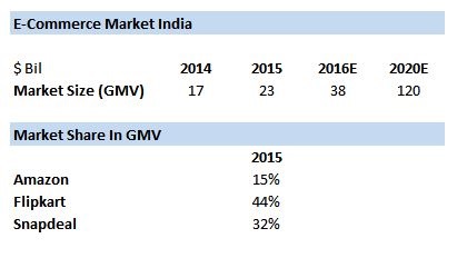 當前,印度電商的市場規模約為380億美元,預計到2020年增長到1200億美元。全國擁有2200萬網購消費人群,人均網購花費名列世界第十,在巴西和俄羅斯之前。印度市場看上去就是一塊肥美的肉,如狼似虎的國際電商都虎視眈眈,但是由于印度政府長期以來對本國電商市場奉行保護主義政策,外資電商一直被束縛著手腳,對這塊肥肉只能眼睜睜的看著卻無處下口。哪怕是強如亞馬遜,在印度市場的占有率也只能被有天然優勢的Flipkart和Snapdeal這兩個地頭蛇牢牢壓制。