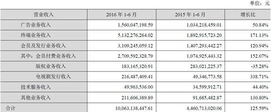 報告期內,樂視網實現營業總收入100.63億元,同比增長125.59%;扣除非經常性損益后的歸屬于上市公司普通股股東凈利潤2.68億元,同比增長54.63%。