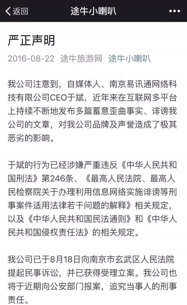 途牛旅游網昨日在公司官方微信公眾號“途牛小喇叭”發布公告,自媒體人、南京易迅通網絡科技有限公司CEO于斌多次發布歪曲事實、誹謗途牛的文章,故對于斌提起民事訴訟。