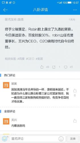【環(huán)球科技報道 周濤】昨天,脈脈匿名區(qū)有爆料稱,“終于塵埃落定,Robin臉上露出了久違的笑容。今日美團妥協(xié),百度控股30%,robin出任名譽董事長,王興為CEO,O2O燒錢時代自今日終結(jié)。”