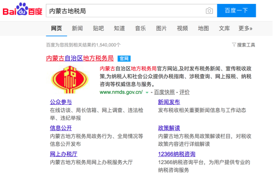 “百度政務生態計劃”的實施對政府、網民二者實現良性溝通有著重要意義。一方面,通過百度專業優待的抓取和收錄機制,政府這樣的稀缺資源可以在百度搜索結果頁展現上優化,從而實現政府官方內容生態和服務生態建設;另一方面,通過政務信息的整合,接入該計劃的政府官網可實現服務信息的外顯,即百度將在搜索結果的頂端卡片中直接呈現網站內部欄目,網民通過點擊所需服務可直達該欄目內頁,實現更便捷的政務信息獲取。例如,搜索“國家稅務總局”,從官網卡片頁上點擊“稅務要聞”等欄目,便可直接跳轉至該官網子頁,了解稅務要聞。