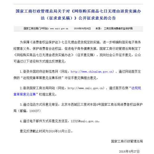 【環(huán)球科技報(bào)道 周濤】今日,工商總局公布《網(wǎng)絡(luò)購買商品七日無理由退貨實(shí)施辦法》并向社會(huì)公開征求意見。《征求意見稿》明確,網(wǎng)絡(luò)商品銷售者應(yīng)當(dāng)履行七日無理由退貨義務(wù)。經(jīng)營者采用電視、電話、郵購等方式銷售商品,參照本辦法執(zhí)行。辦法自2017年3月15日起施行。