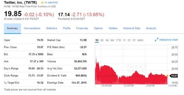 上周五,Twitter股價收于19.85美元。今日盤前交易中,Twitter股價一度跌至17.28美元,意味著市值約為122.3億美元,而2013年12月時曾高達530億美元。截至北京時間今日20:52分,Twitter股價報于17.14美元,下滑13.65%。