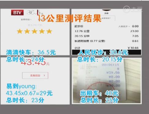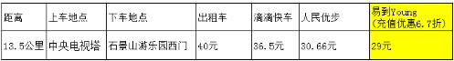 從中央電視塔到石景山游樂園西門,13.5公里。出租車花費(fèi)了40元,滴滴快車是36.5元,人民優(yōu)步是30.66元,而易到y(tǒng)oung車型花費(fèi)的是43.45元,但是我們可以看到它通過折扣后是29元。