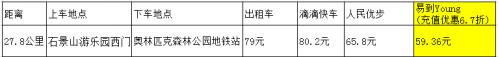 從石景山游樂園西門出發(fā),到奧林匹克森林公園地鐵站,行程是最長的,27.8公里。滴滴快車80.2元,人民優(yōu)步65.8元,易到y(tǒng)oung車59.36元,出租車79元。