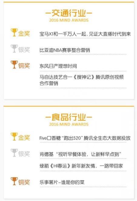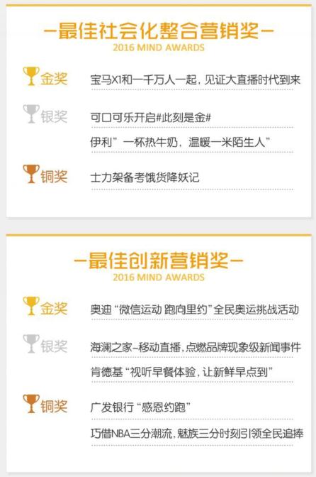 11月1日,2016騰訊MIND AWARDS揭曉了各獎項的最終歸屬。本屆MIND AWARDS從案例征集到最終評審前后歷時近3個月,22位來自跨國品牌及全球頂尖營銷代理機構的業界權威和營銷專家全程參與評審工作,最終評選出全場大獎、行業獎項、各類單項獎及新生代實效營銷獎49個。
