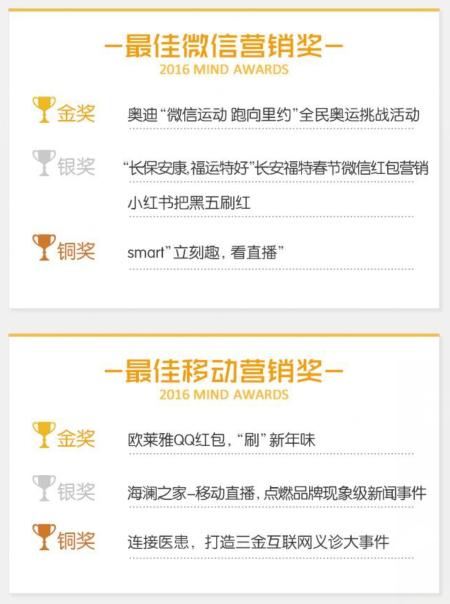 獲得本屆MIND AWARDS最佳創新營銷獎的“奧迪‘微信運動,跑向里約’全民奧運挑戰活動”,結合時下火熱的跑步運動場景,以及騰訊在體育領域強大的品牌號召力,利用運動監測技術,邀請用戶進行線上到線下的跑步挑戰活動。年輕用戶最熱愛的健身運動,結合時尚社交行為,贏得了2900萬網友的參與。