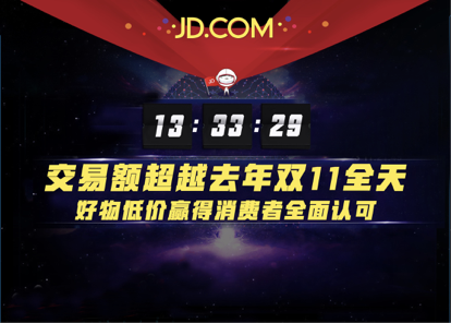 11月11日下午消息,京東方面表示,13:33:29,京東商城交易額超過去年雙11的全天交易額。