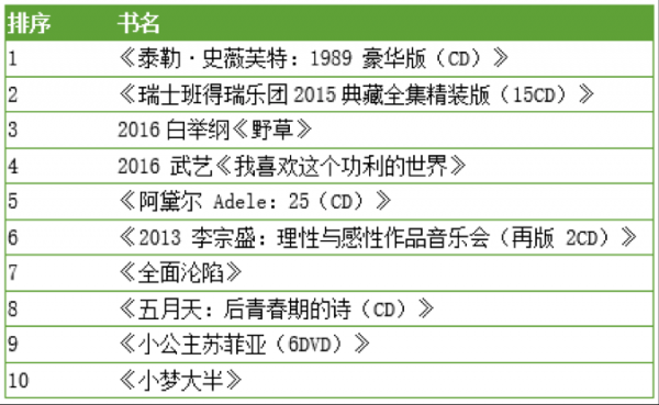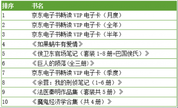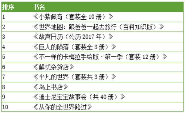 從銷售單品看,讀者最喜歡前十種書中,文學(xué)書占5本,少兒書4本。Top5分別是:《小豬佩奇(套裝全10冊(cè))》、《世界地圖:跟爸爸一起去旅行(百科知識(shí)版)》、《故宮日歷(公歷2017年)》、《巨人的隕落(套裝全3冊(cè))》、《不一樣的卡梅拉手繪版·第一季(套裝12冊(cè))》。最受歡迎的音像產(chǎn)品前五名分別是:《瑞士班得瑞樂團(tuán)2015典藏全集精裝版(15CD)》、白舉綱的《野草》、武藝的《我喜歡這個(gè)功利世界》、《阿黛爾 Adele:25(CD)》。最受歡迎的電子書商品,前三名都是電子書暢讀VIP電子卡,分別是月度卡、全年卡和半年卡,第四和第五名分別是《如果蝸牛有愛情》、《侯衛(wèi)東官場(chǎng)筆記(套裝1-8冊(cè)+巴國(guó)侯氏)》。