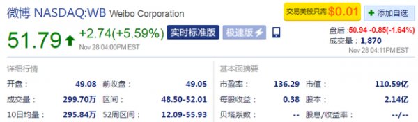 微博(NASDAQ: WB)周一收盤股價(jià)上漲2.74美元,至51.79美元,漲幅達(dá)5.59%。微博市值達(dá)到110.59億美元。
