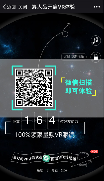 當不少人聽見“要邀請169個微信好友才能獲得VR眼鏡”這個規則之后,不少人覺得門檻高、很難實現,但是百度VR瀏覽器此次推出的“籌人品開啟VR體驗”的H5活動,卻打破了這個認知。