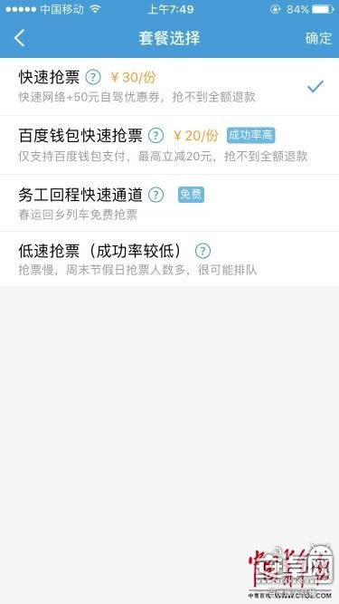 攜程旅行也推出了同樣價格的搶票服務套餐,不同價格套餐背后注釋“牛逼!”“成功率高”“成功率較低”的字樣。去哪兒網則在不同價格的服務費后標注了“20元:成功率提升50%”“30元:成功率提升80%”。