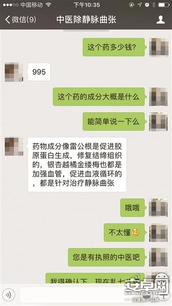 今年1月,北青報(bào)記者添加了該賬號(hào)作為好友,發(fā)現(xiàn)對(duì)方仍使用袁珊醫(yī)生的照片作為頭像。好友申請(qǐng)通過(guò)后,對(duì)方很快詢(xún)問(wèn)說(shuō),“是否需要治療靜脈曲張”,并要求告知性別、年齡、發(fā)現(xiàn)時(shí)間以及發(fā)病部位照片等信息。北青報(bào)記者將一張網(wǎng)絡(luò)圖片發(fā)給對(duì)方后,對(duì)方回復(fù)稱(chēng)“患者”已經(jīng)是“重度凸起”了,已發(fā)生“靜脈膜受損引起血液逆流”現(xiàn)象,想要治好,就需要從他那里配置一個(gè)療程45天,總價(jià)為995元的外用泡腳的中藥粉,作用是“修復(fù)受損的靜脈瓣膜,改善微循環(huán),讓血液正常流向心臟,恢復(fù)正常”。