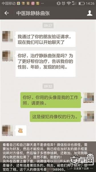 袁醫(yī)生介紹說(shuō),不久前有患者向自己反映稱(chēng),一個(gè)名為“中醫(yī)除靜脈曲張”的微信賬號(hào)疑似打著袁醫(yī)生的名號(hào)為大家看病診治。袁醫(yī)生添加該微信號(hào)后發(fā)現(xiàn),對(duì)方所使用的頭像恰好是自己在醫(yī)院拍攝的身穿白大褂的工作照,此前曾被自己用作微博頭像。一番交涉后,對(duì)方答應(yīng)撤掉袁醫(yī)生的照片,但卻遲遲沒(méi)有行動(dòng),后來(lái)還索性將袁醫(yī)生拉入黑名單中。