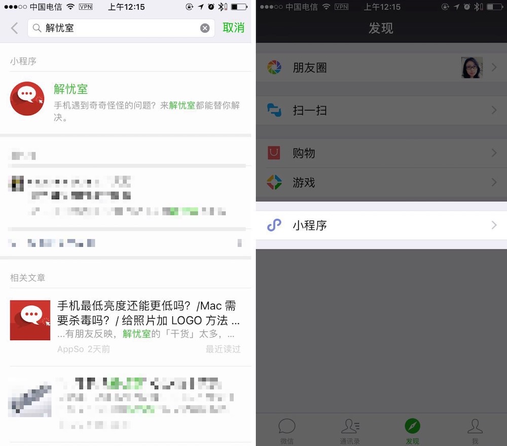 如果你還沒有使用過任何小程序,現(xiàn)在在微信首頁的搜索框搜索「解憂室」,點(diǎn)擊解憂室的小程序,發(fā)現(xiàn)頁面的入口就會(huì)顯現(xiàn)出來。