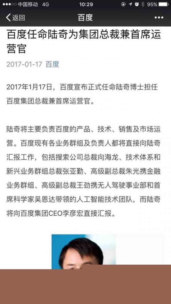 繼李叫獸成為最年輕的百度副總裁刷屏后,今天一早,前微軟全球執行副總裁陸奇被任命為百度集團總裁兼首席運營官的公告又一次刷屏。