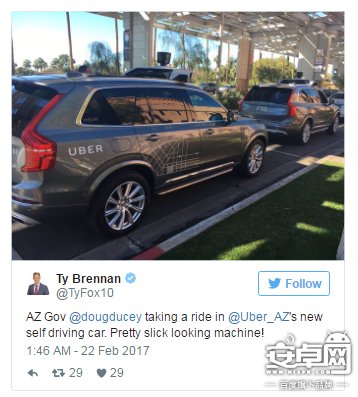 據(jù)當(dāng)?shù)孛襟w報道,從今天開始,Uber無人駕駛汽車將開始在亞利桑那州街頭測試載客,而亞利桑那州州長Doug Ducey 也進行了試乘體驗。