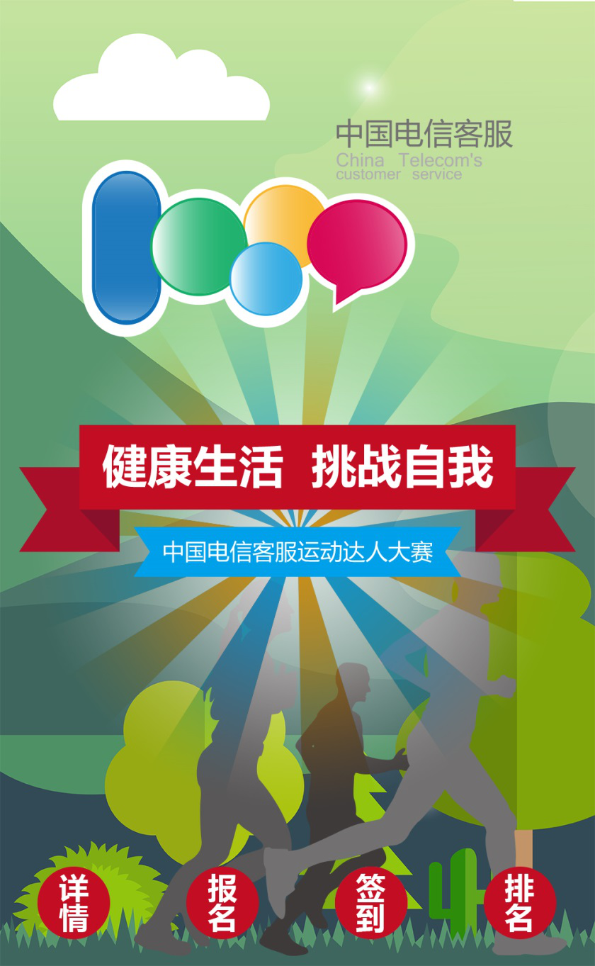 為響應全民健身號召,引導積極向上的生活方式,中國電信客服于2017年4月12日-26日在微信客戶端舉辦“健康生活 挑戰自我”運動達人大賽,春風十里運動有你,多樣好禮“翼”起來!活動參與者只需每天完成規定的運動里程便可獲取積分,還能為自己和好友加油助威,最終根據排行名次獲得相應的獎品。
