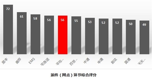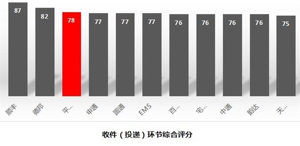 在綜合評分中,順豐奪得83分,高出平均分8分。此外,除了德邦高出4分外,其他快遞公司評分相差無幾。
