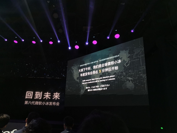 目前發布會已經開始,現場,小冰用中、美、日三種聲音講解,來自最新的微軟語音合成技術,從形式上就頗有未來感。